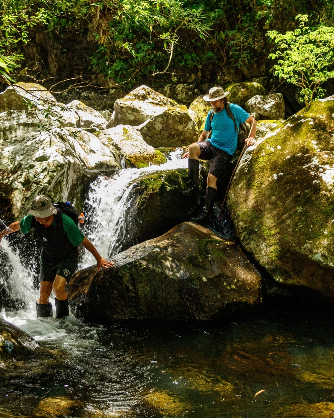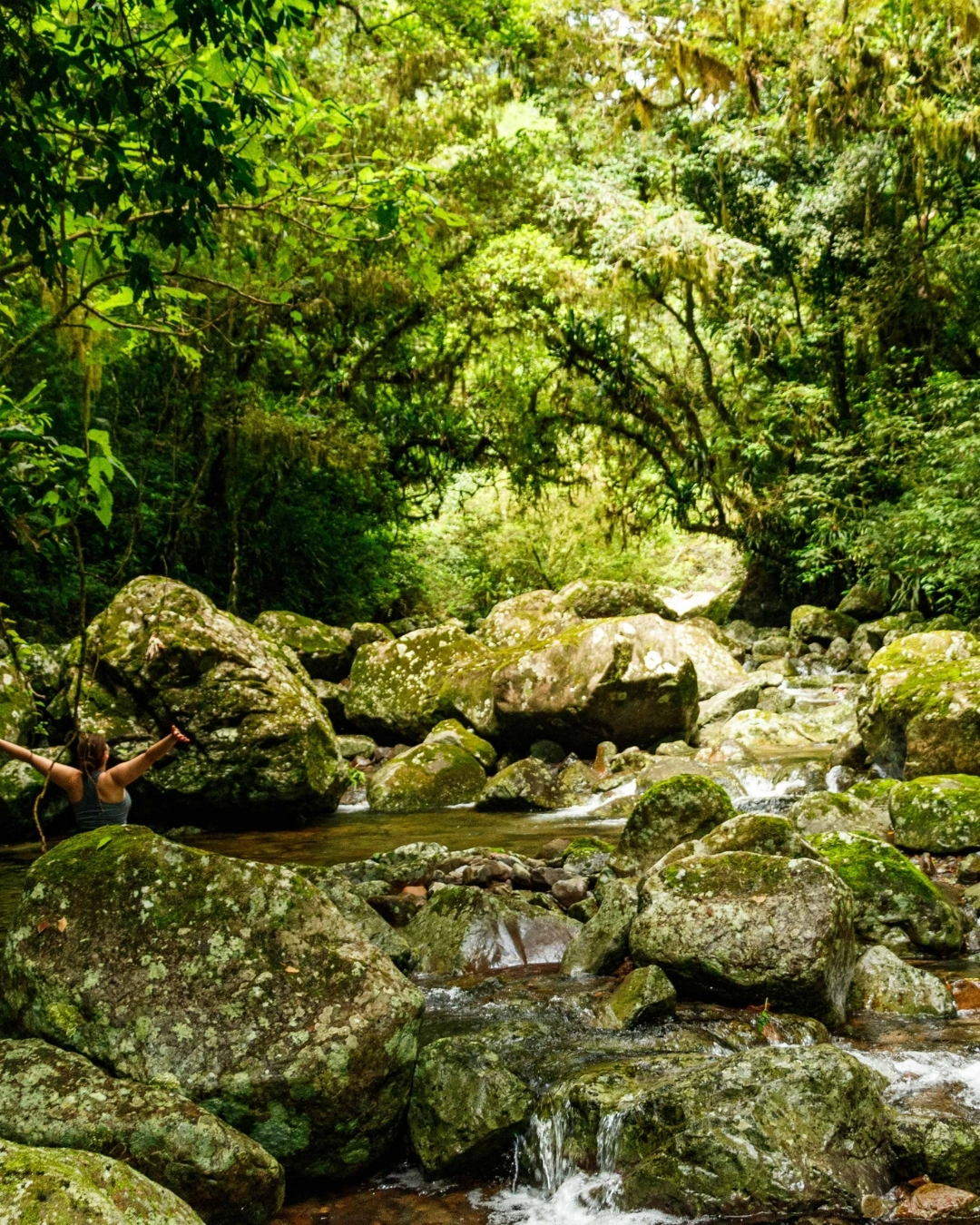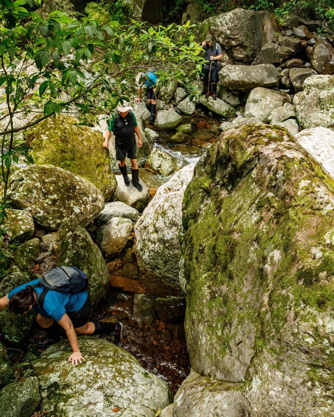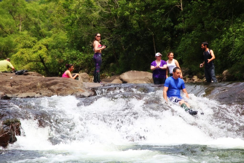 Caminhando por trilhas na mata Atlântica, com subidas e descidas pelo leito do rio, com pedras de tamanhos variados, sendo obrigatório caminhar pela água para poder chegar na cachoeira, ponto final do percurso.