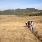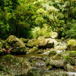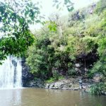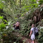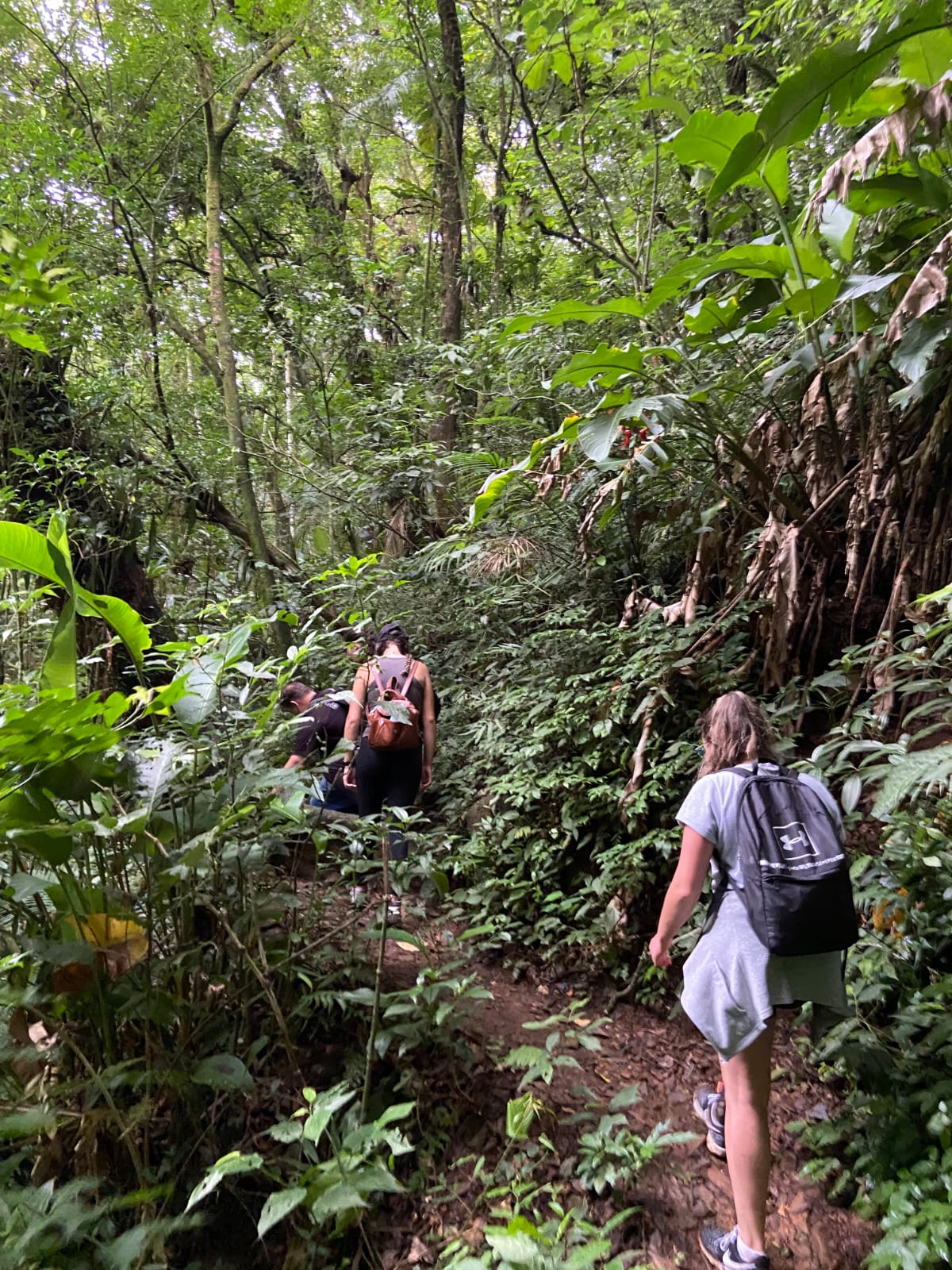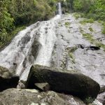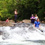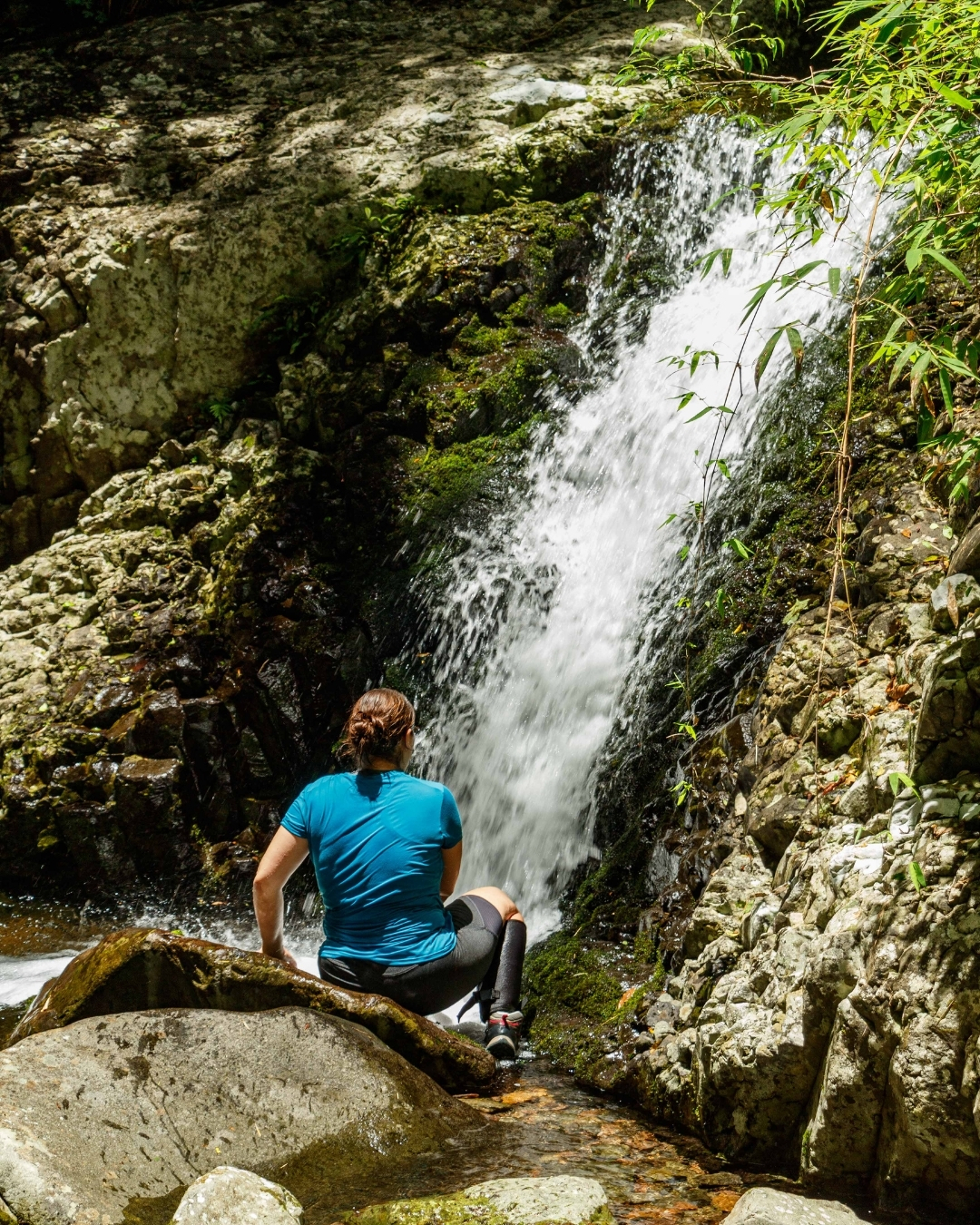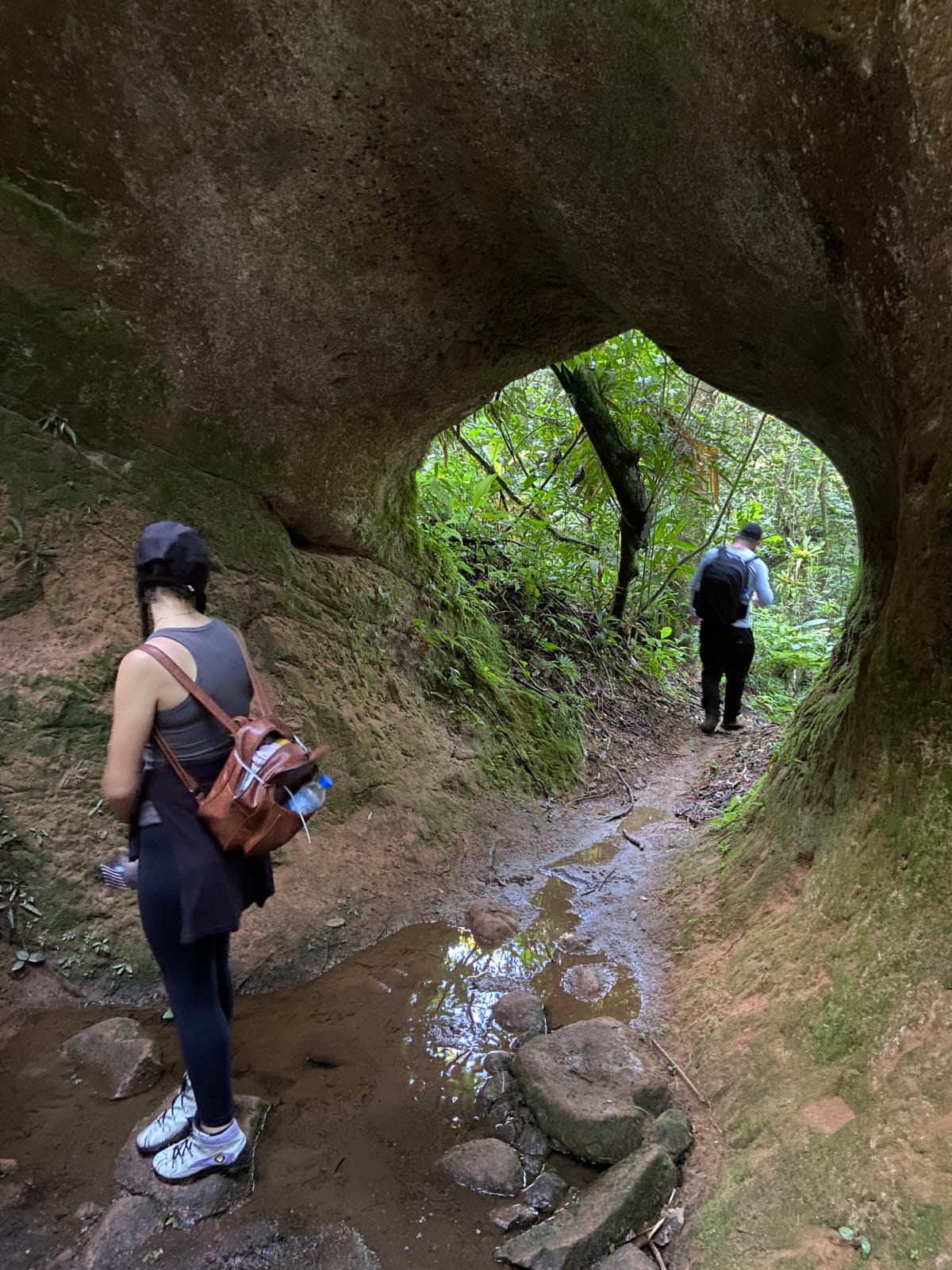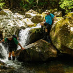 Caminhando por trilhas na mata Atlântica, com subidas e descidas pelo leito do rio, com pedras de tamanhos variados, sendo obrigatório caminhar pela água para poder chegar na cachoeira, ponto final do percurso.